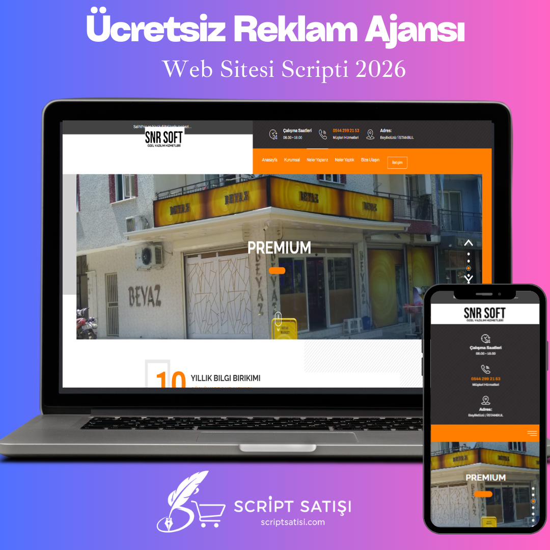 Reklam ajansları, sosyal medya yönetimi yapan firmalar ve dijital pazarlama hizmeti sunan işletmeler için geliştirilmiş ücretsiz kurumsal web sitesi scriptidir. SNR Soft tarafından özel olarak geliştirilen bu yazılım, ajansların hizmetlerini profesyonel şekilde tanıtabilmesi ve müşteri kazanımını artırabilmesi için optimize edilmiştir.
